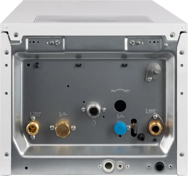 Ключевой элемент котла - это высокоэффективный теплообменник, изготовленный из чистой меди по технологии "Oxygen-Free", что обеспечивает его надежность. Конструкция также включает конденсационный экономайзер для увеличения тепловой эффективности и модулируемую горелку, поддерживающую широкий диапазон мощностей. Надежность и долговечность котла дополнительно гарантируются благодаря гидравлическому блоку, выполненному из качественной латуни.