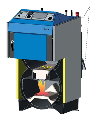 Пиролизный котел Атмос DC 30 SX оснащен вытяжным вентилятором для подачи кислорода в топку и отвода продуктов горения.