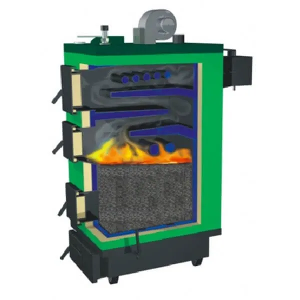 Котел оснащается трехтяговой камерой сгорания, имеет как верхний, так и нижний способ загрузки горючего материала